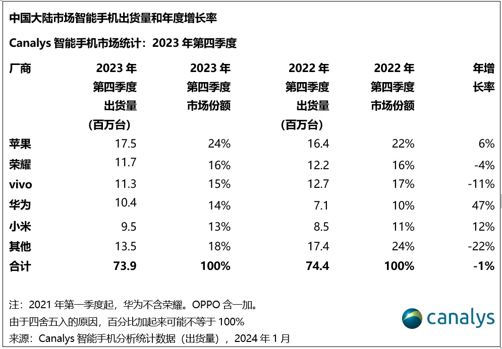 Canalys:2023 Q4 中国手机市场跌幅收窄至 1%,华为猛增 47% 回归前四