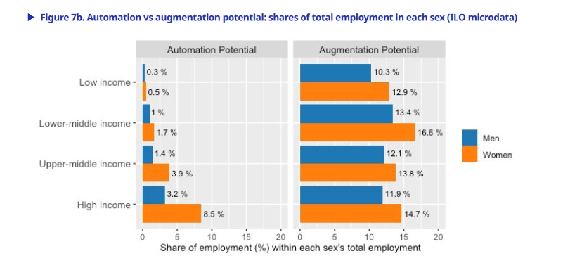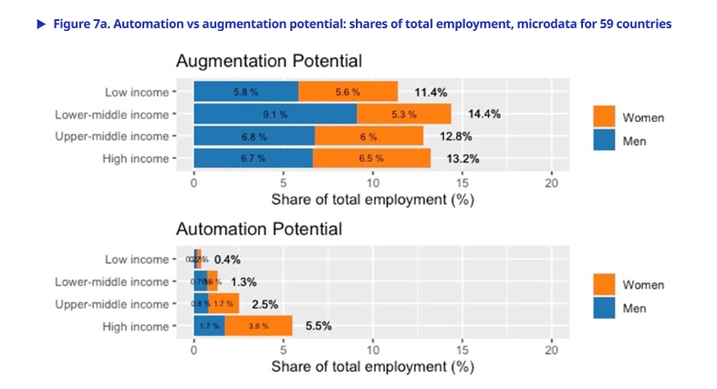 研究陈述称尤其在发达国家,在文书相关岗位中女人职工的占比更高。在高收入国家,8.5% 的女人作业岗位能够完结高度自动化,而男性作业岗位占比为 3.9%。